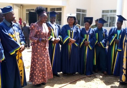 Mkuu wa Wilaya ya Njombe Bi Ruth Msafiri meza kuu akiwa kama mgeni rasmi katika zoezi la uzinduzi wa gari la kubeba taka katika Halmashauri ya Mji wa Makambako gari ambalo limenunuliwa kwa kutumia map...